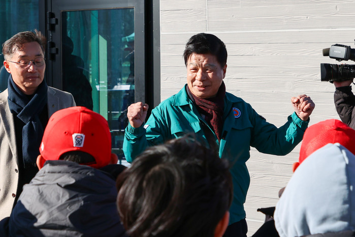 | ▲이상근 고성군수는 3일 2025년 동계 전지훈련팀을 격려하기 실내체육관 및 야구장을 방문했다. (사진=고성군) |
