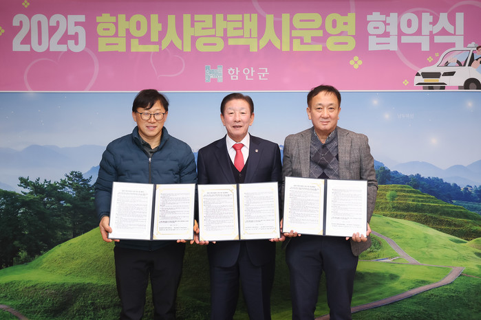 | ▲함안군은 30일 군수실에서 함안택시(유)(대표 홍성갑), (유)통일택시(대표 홍성기)와 함께 2025년 ‘함안사랑택시 운영 지원사업’ 협약식을 가졌다. (사진=함안군) |