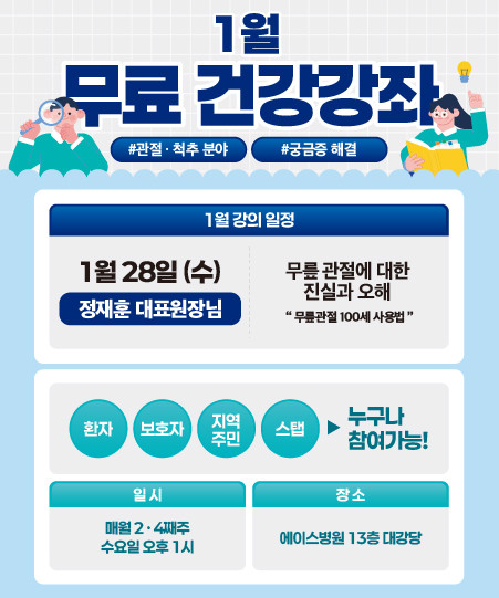 강좌는 매월 2, 4번째 주 수요일 오후 1시, 에이스병원 13층 대강당에서 진행되며, 환자·보호자·스탭·지역 시민 누구나 무료로 참여할 수 있다. 강의는 관절·척추 분야 전문 의료진이 돌아가며 진행하며, 생활 속에서 실천 가능한 건강 정보를 제공할 예정이다.